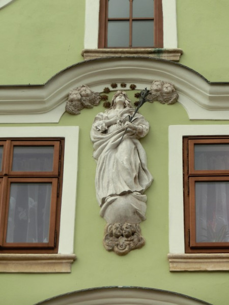 Píďa  -  21. Vyfoťte domovní znamení, které je pod tímto reliéfem a podle kterého se dům jmenuje. Popište, co je špatně na vztahu s okolními budovami.